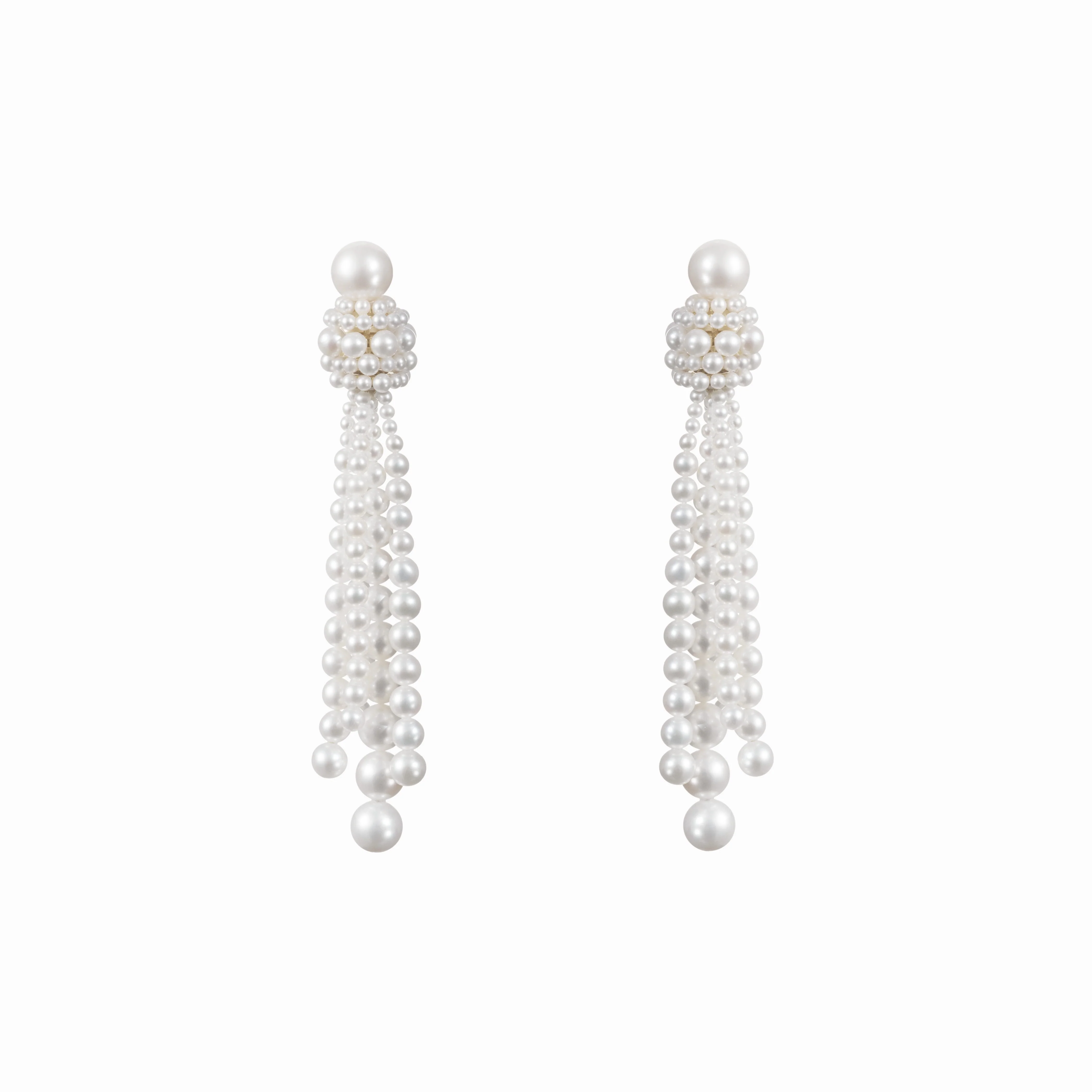 Sophie Bille Brahe is known for her use of pearls in her designs. About these earrings her site explains, “The Colonna Grande is crafted from multiple strings of pearls adding more volume and a three-dimensional ambiance to the earring. With the long pearl strings, Bille Brahe continues to display her beautiful aptitude for transformation, enhancing a new way of working with the pearls. Crafted from 14K certified recycled yellow gold witha total of 275 freshwater pearls.”