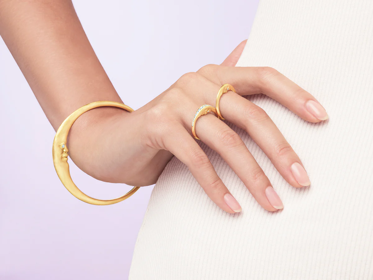 The designer’s site notes, “The celestial collection, our largest collection of jewelry pieces today, tells a story about the cosmos; a journey through the heavens and through the history of art. The collection draws on Tony’s interests in artisan horology, early timekeeping, and the marvelous mechanisms of the Renaissance that combined art and science together. If time and astronomy were even more intimately connected in that age of sundials and planetary prognostication, they were also connected to magic, and the motions of the heavenly bodies were believed to be keys to the secrets of nature. This moonface is an adaptation of one that Tony Lent saw years ago in 19th century illustrations. He refers to it now as the “moon of the collective unconscious”. The moonface represented in Lent’s work is an iteration of those that appear in works by Maxfield Parrish, N. C. Wyeth, and the early animation of Winsor McCay.”