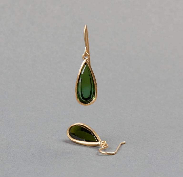 They are made of teardrop shaped Brazilian tourmaline, simply set in 18k yellow gold with shepherd’s crook hooks.
