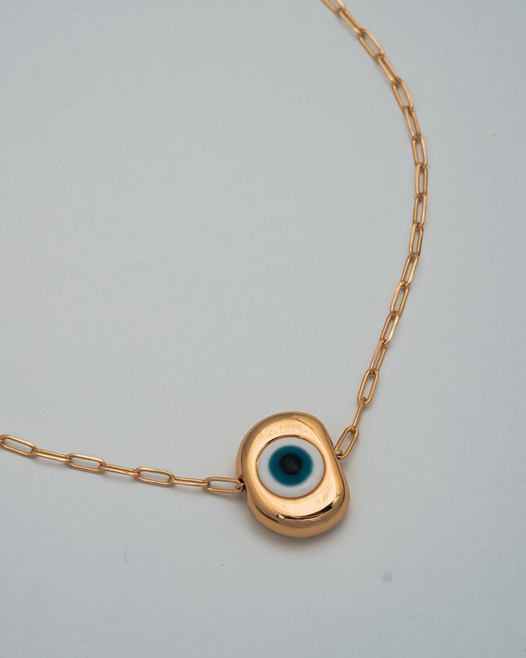 This is made of gold plated brass with what seems to be a glass evil eye shape, about which they say, “BLUE: peace, trust, patience. WHITE: Innocence, cleanliness, self-reflection. GOLD: success, inspiration, generosity” It comes with a very long 28 inch chain and sells for USD$91, half its regular price.