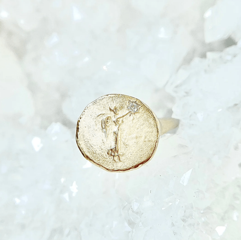 This “to thine own self be true” ring is described as Sicily BC 317; don’t know if that was the inspiration or it’s a copy of an original. The ring is made of 14k yellow gold set with a small diamond, and sells for USD$1780.