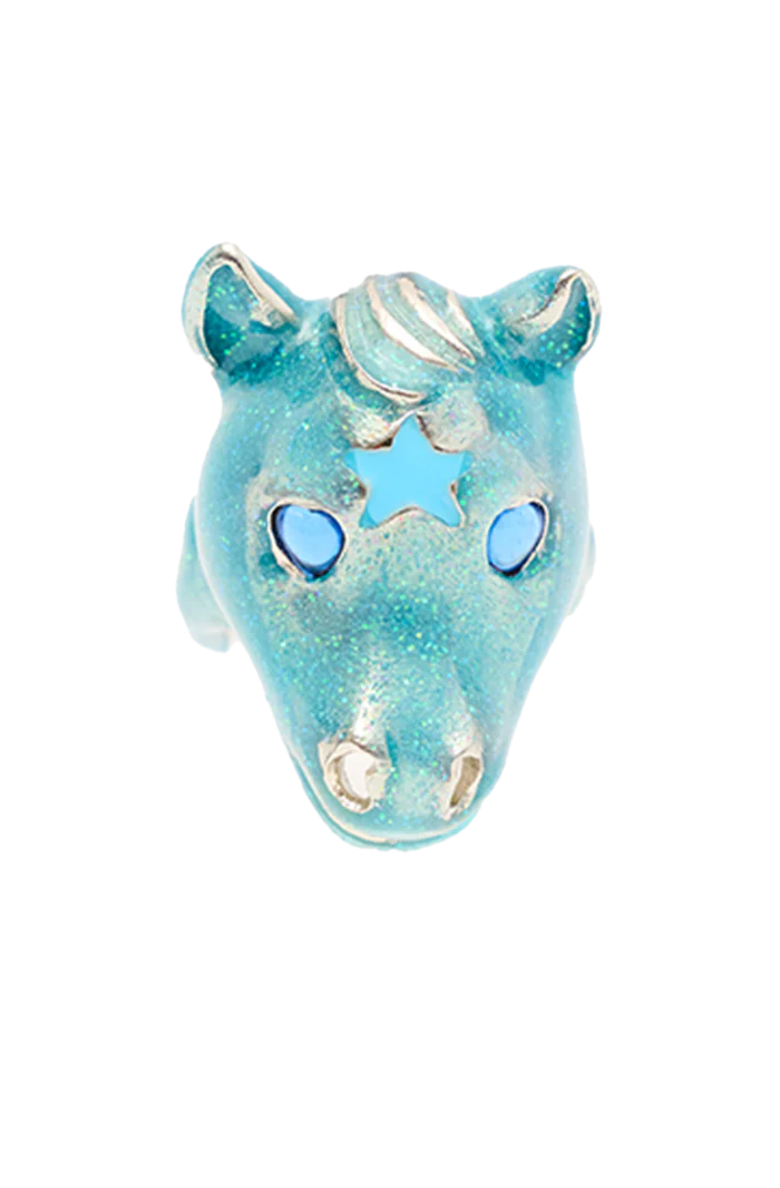 There designs have a fun, almost childlike appeal – who can resist this glitter pony ring, made of enameled pewter? This comes in a dark grey (almost black) and gold coloured version, and sells for USD$170.