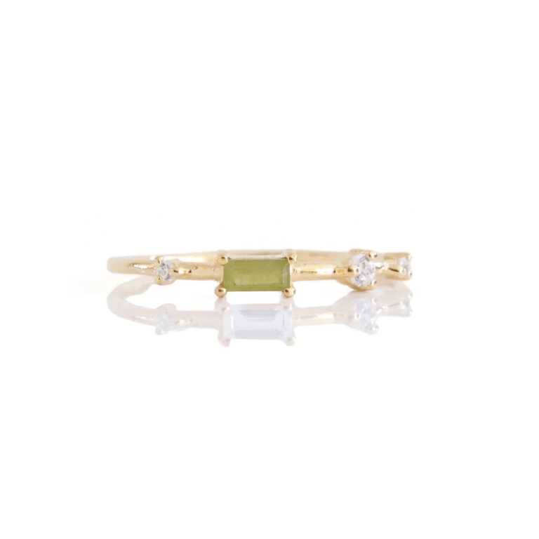 This ring is made of vermeil (gold plated sterling silver), set with vasonite and cubic zirconia. Apparently vasonite releases ego based negativity associated with co-dependent relationships. Promotes joy, self acceptance and independence. Who knew?