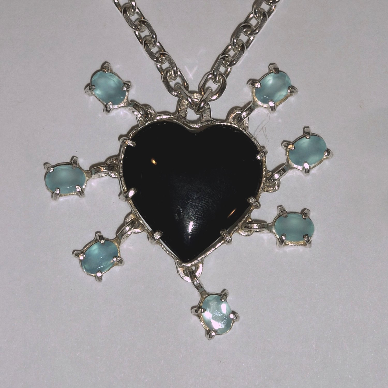 This pendant by Shana Cave comes with an 18 inch chain, and features a black onyx heart and blue onyx drops suspended from it.