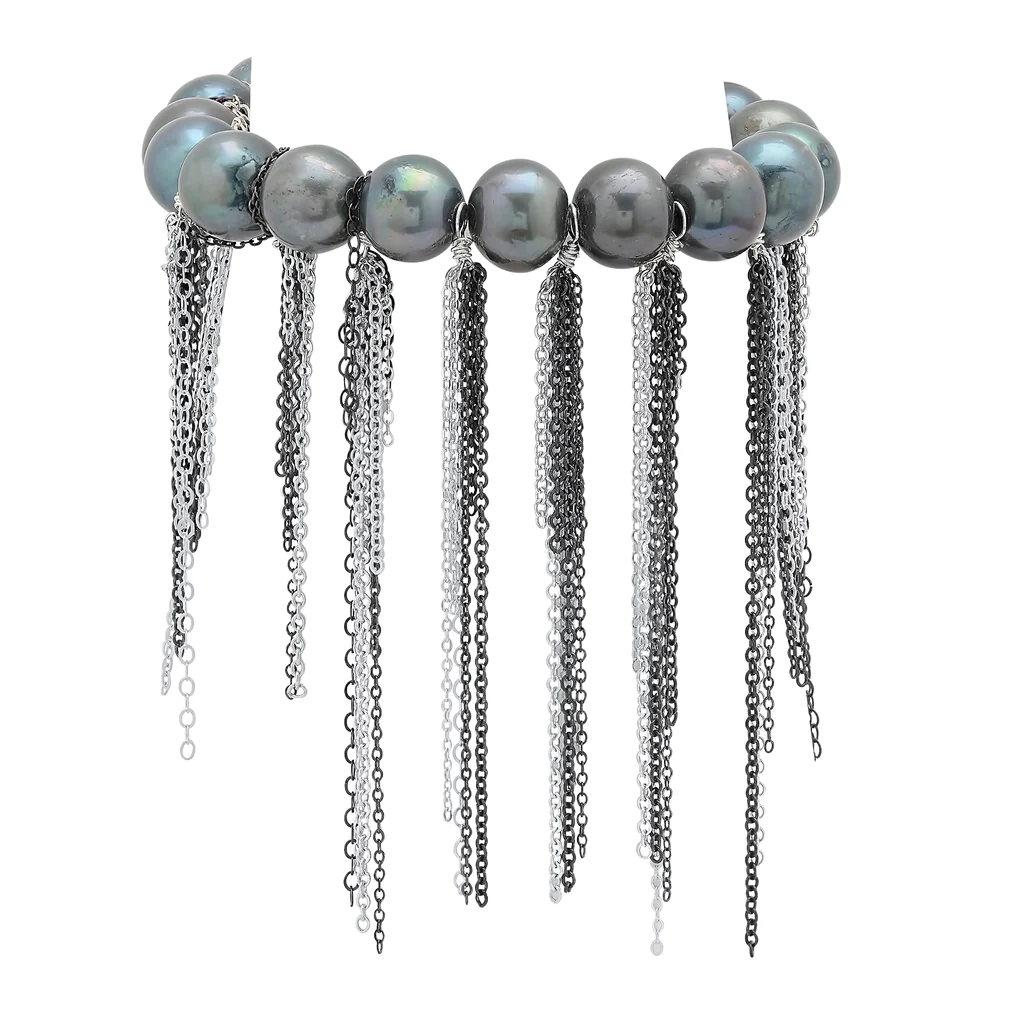 This bracelet by Samira 13 is a stretch piece with freshwater pearls and long fringe made of sterling silver.