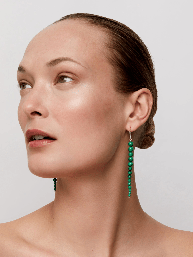 The shoulder duster style features graduated malachite beads with a 14k yellow gold shepherd’s hook set with .16 carats of diamonds. They are four inches long but I imagine pretty light to wear and they have great impact.