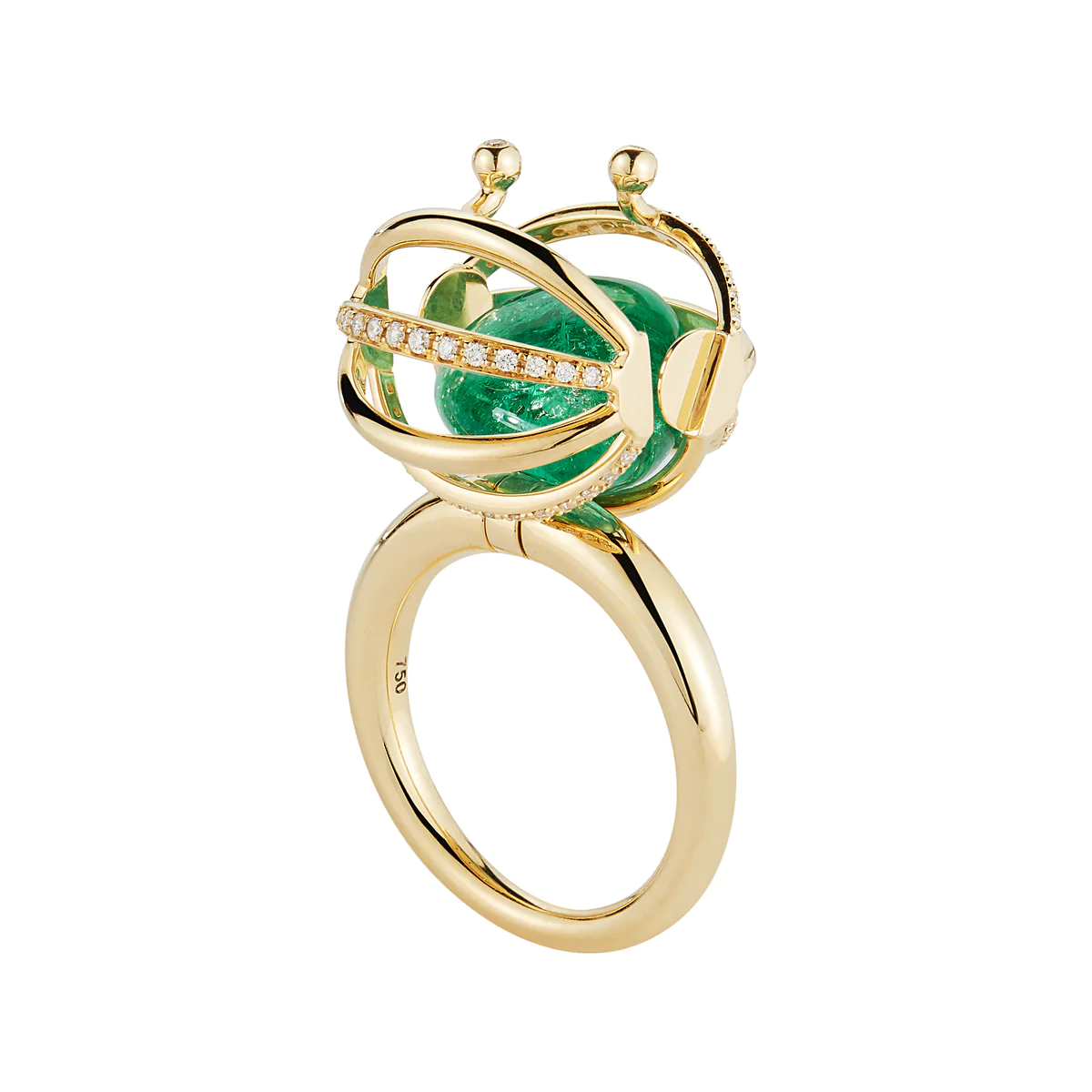 This is an interesting design (and concept) from Katherine Jetter. It appears to use a kiss lock closure (like the ones on vintage change purses) but it also notes that the ring does not include the round gemstone as shown.