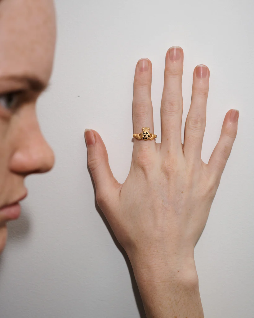 This ring is made using the cladagh (clasped hands) motif, only they aren’t holding the familiar heart but a chocolat chip cookie with crystal “chips.” Yours for USD$240.