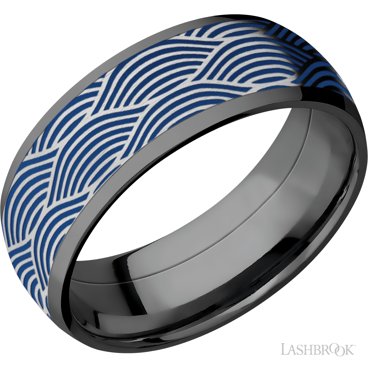 This one is described as, “8 mm wide/domed/zirconium band with one 6 mm centered inlay of cobalt chrome with a laser carved navigator pattern.”