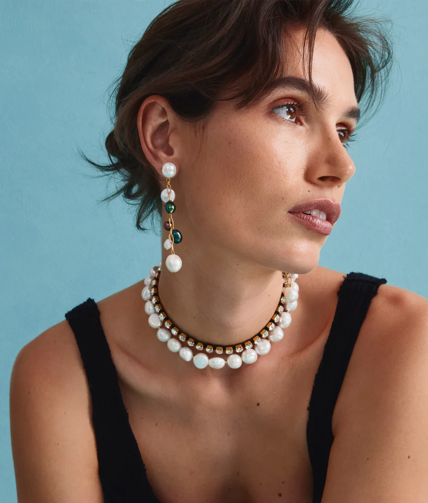 “This multi-strand collar necklace pairs luminous freshwater pearls alongside gold-plated rhinestone crystal chain, hand-wrapped with black cotton thread.”