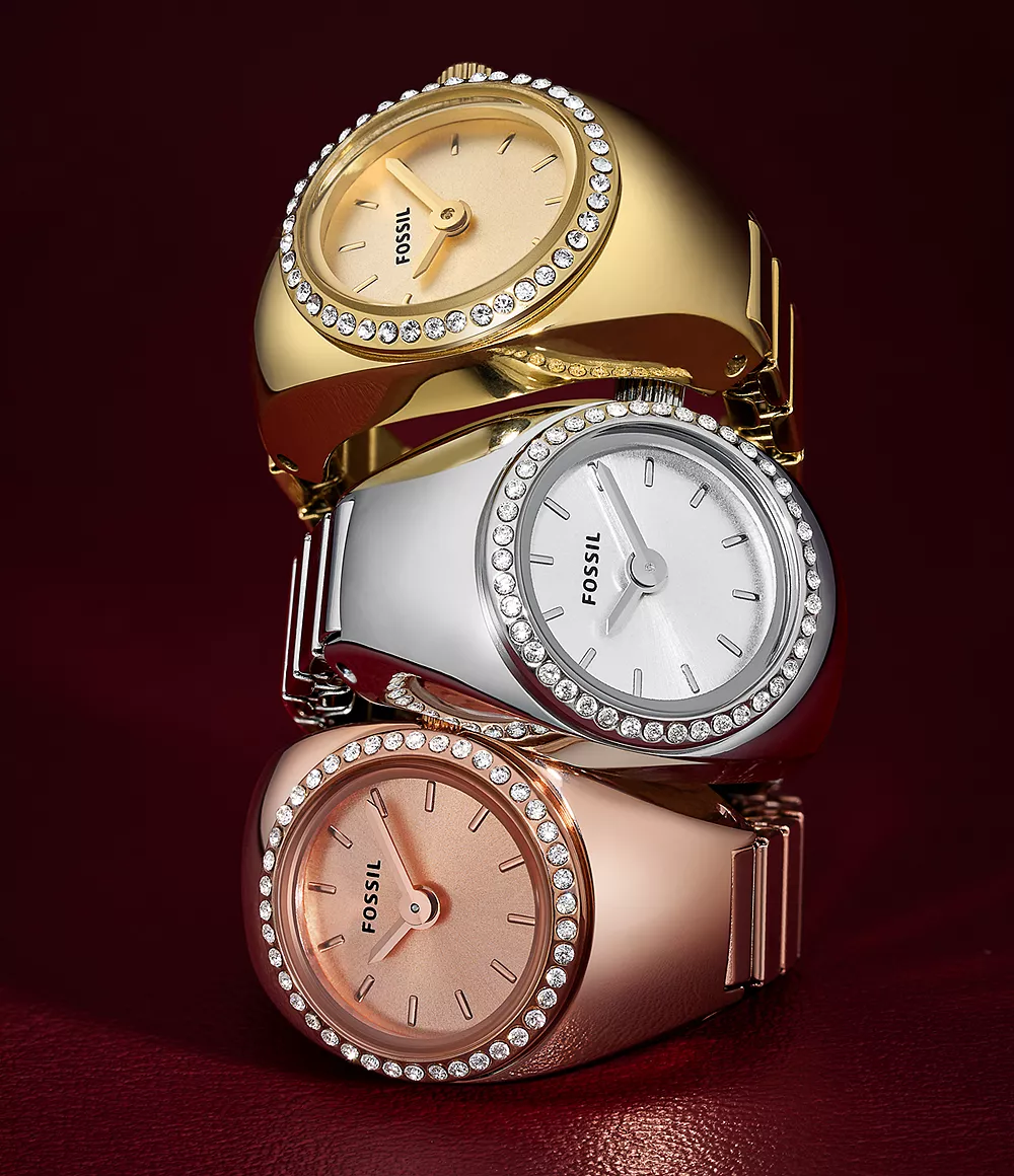This watch ring by Fossil is a cool way to keep track of time. It’s made of stainless steel and available in silver, rose or gold tone. It sells for USD$150.