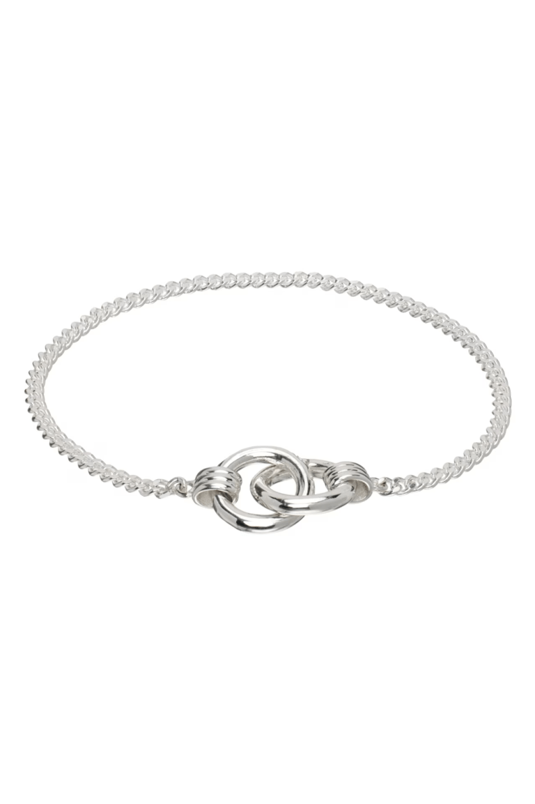 This bracelet features fine links with a centre interlocking circle motif. Made in sterling silver, it sells for USD$255.