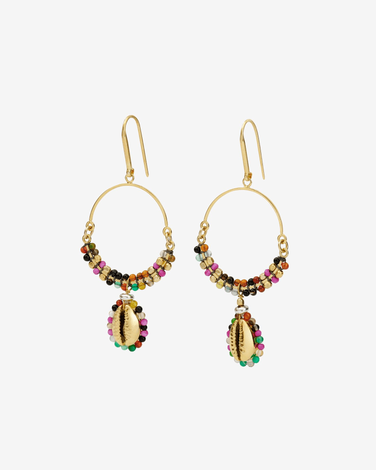 Made of brass and accented with beads, they also feature a metal cowrie shell. Perfect for carefree summer days, these sell for €190.