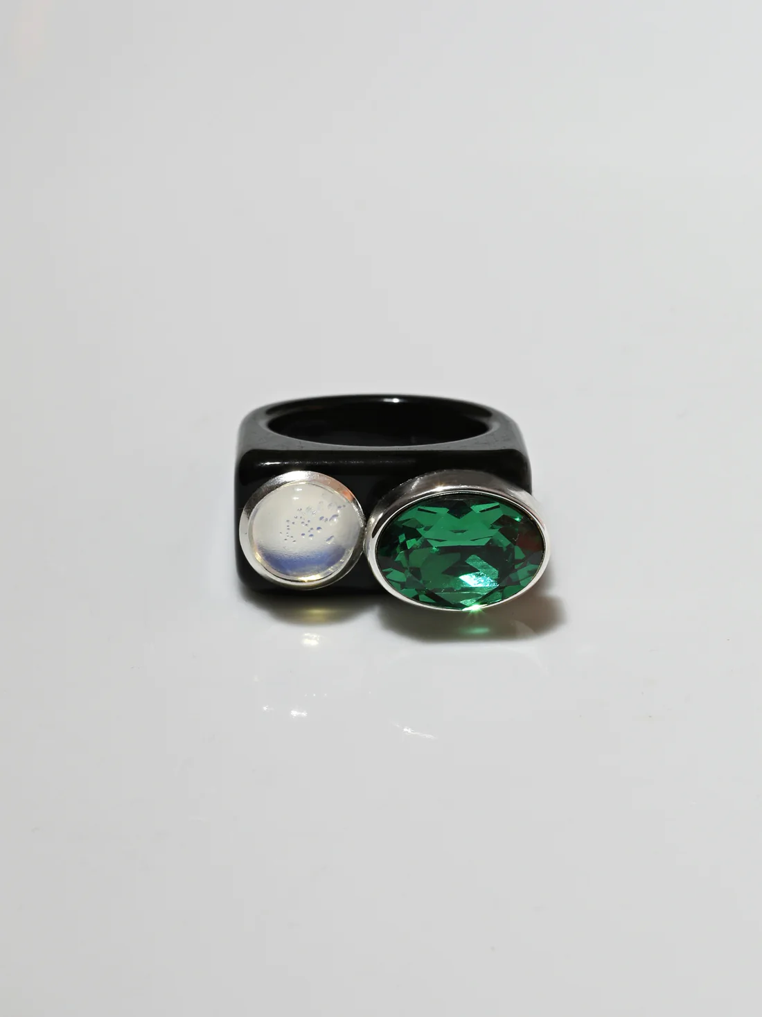 This bold ring by Mounser is a limited edition piece made with oversized crystals with acrylic and lucite bases. It is priced at USD$133.