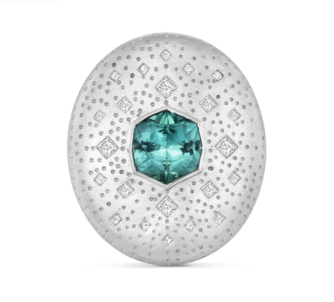Meredith Young created this piece: “One hexagon cut seafoam tourmaline from Afghanistan sits on a slightly domed oval surrounded by princess diamonds graduating outward. Adding to the three dimensionality of this ring, graduated sized princess diamonds move down the shank as if dissolving. Tiny concave marks in the gold are placed by hand and continue this idea of dissolving chaos. Inside the gallery features curved lines that radiate outward. Set in 18k white gold with satin finish, this ring features a 4 carat tourmaline and 1.66 ctw of white princess diamonds.”