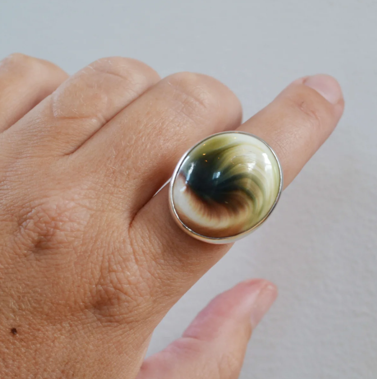 This cool ring by Glamrocks uses operculum (part of a sea snail) as its focal point, set into a sterling silver band.