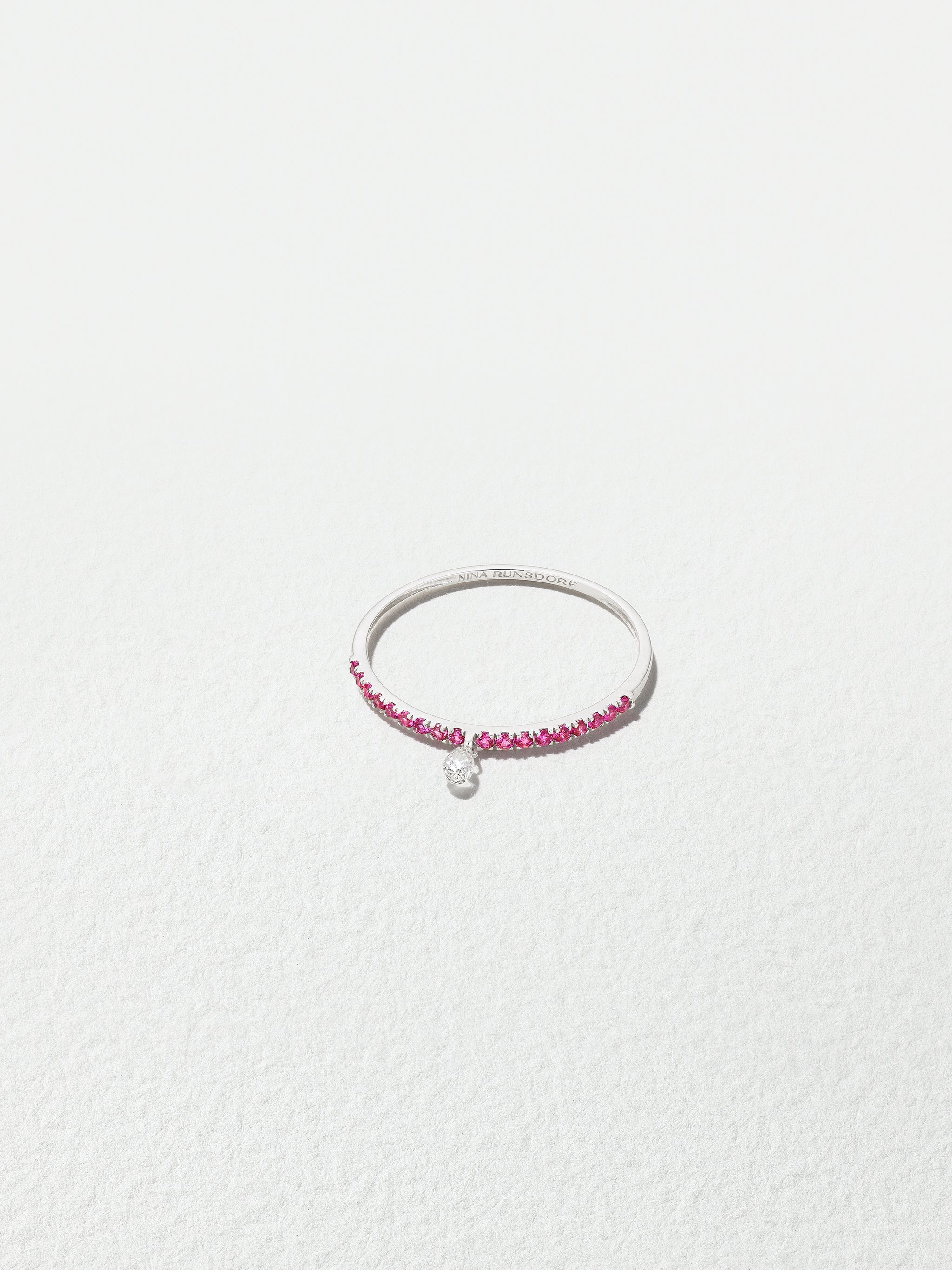 It’s a thin 18k white band set with .25 carats of ruby, and accented with a .10 carat white diamond briolette which moves freely.