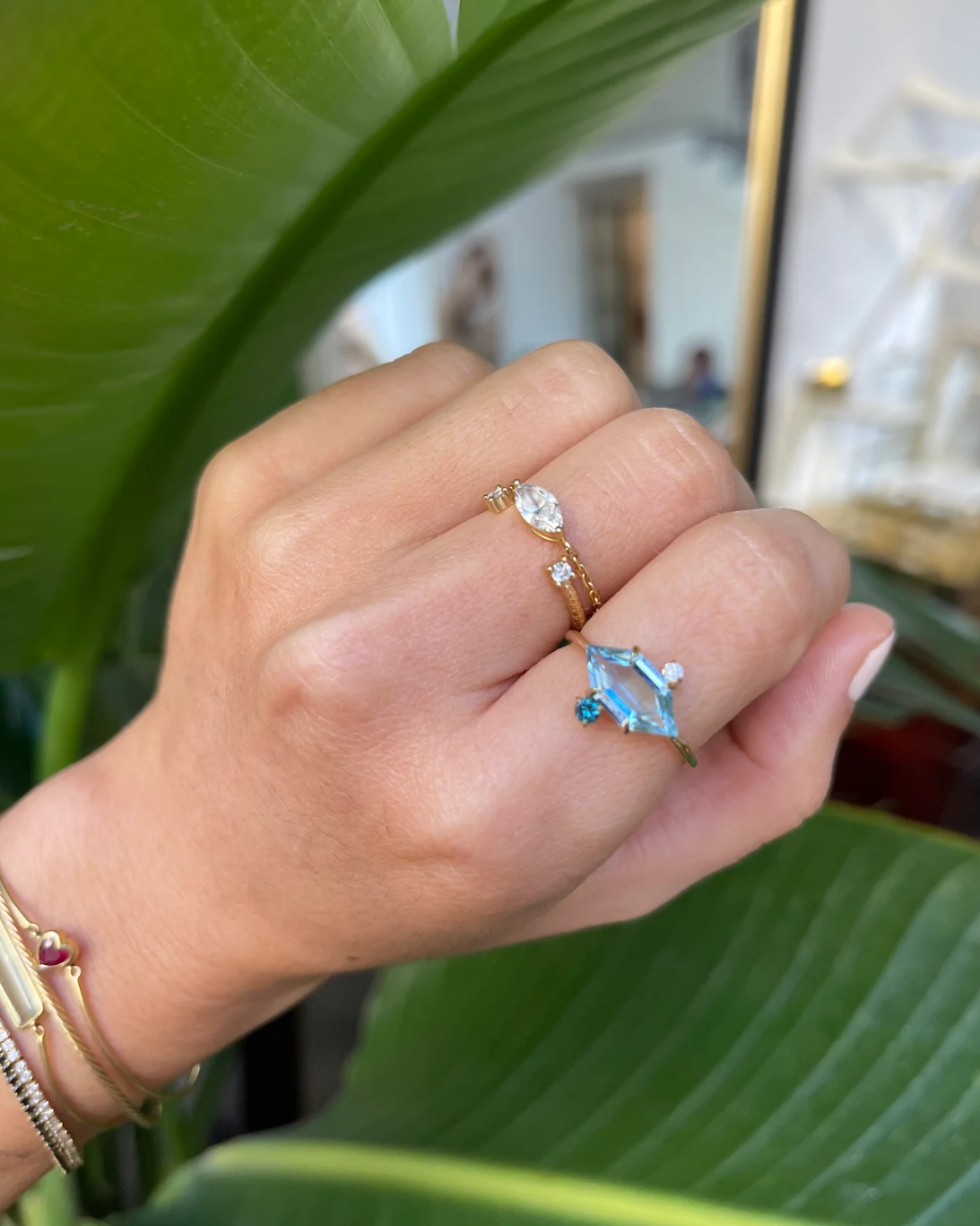 This ring by Yi Collection showcases a uniquely cut aquamarine stone, the star of the show, shown here on the model’s index finger.