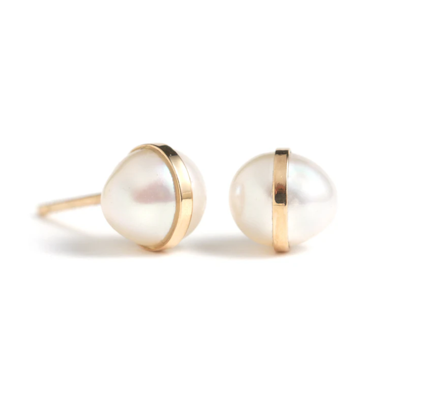 She’s incorporated the gold setting into a visible part of the design, with a sleek band wrapping the potato pearl she’s used. They are available in 14k yellow gold or sterling silver, using a 5.5 to 6mm pearl.