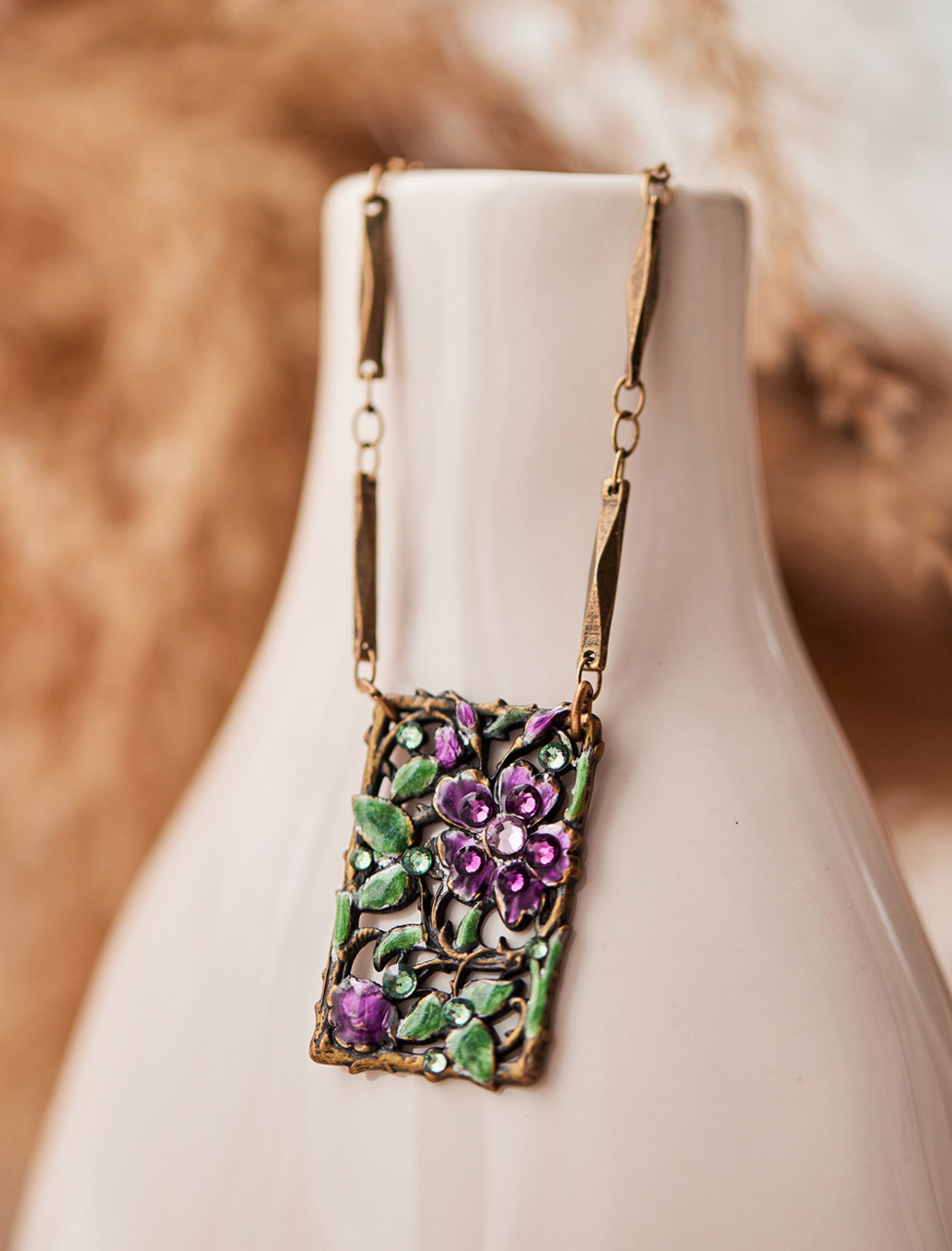 This is made of cold painted enamel on brass, with a smattering of crystal accents. Her site explains, “Add some nature-inspired beauty with this Art Nouveau influenced necklace. Hand-enameled vine and flower details and brilliant crystal accents make this piece a graceful addition to any look. April is thrilled to partner with great American designers like Anne Koplik- whose vintage, heirloom inspired jewelry makes you feel beautiful inside and out.”