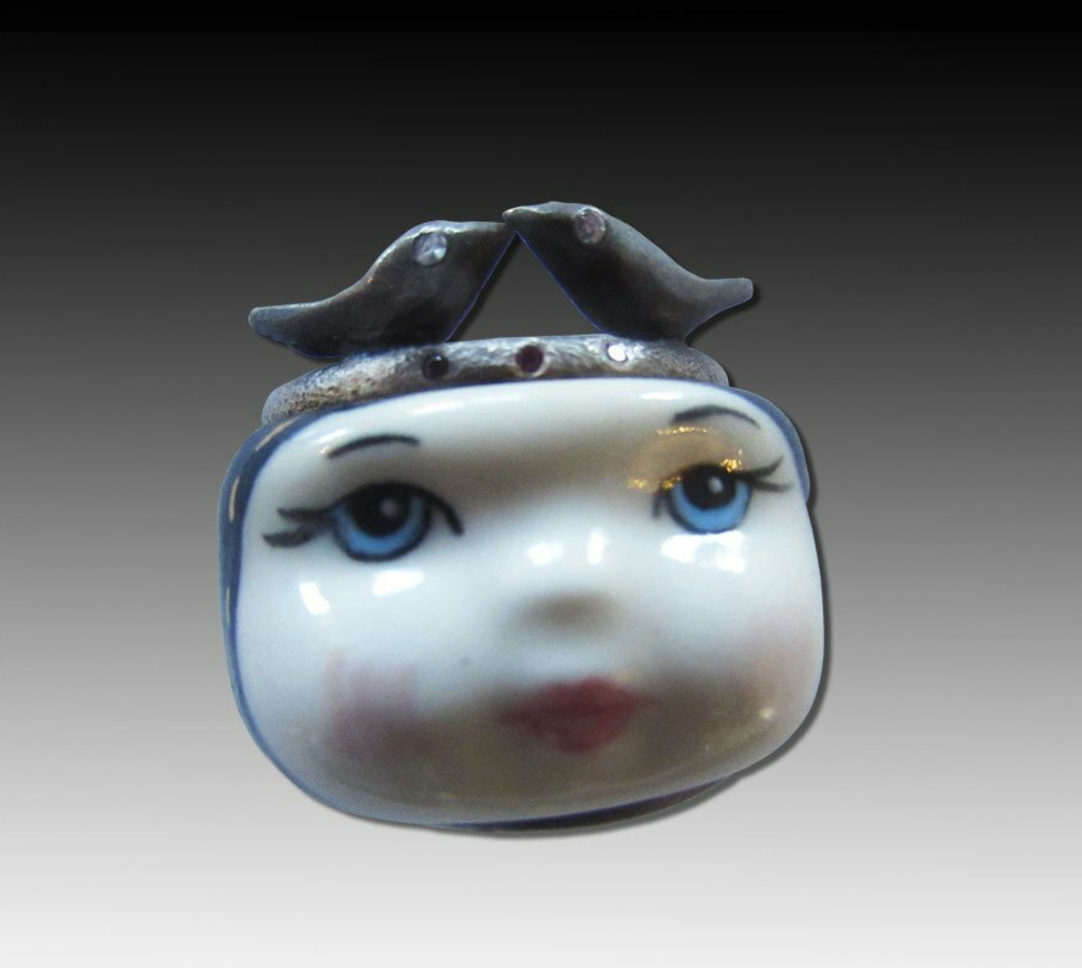 Melinda Risk designs quirky and interesting jewelry. Here, a ring using a porcelain kewpie doll face set into sterling silver and accented with diamonds and rubies.