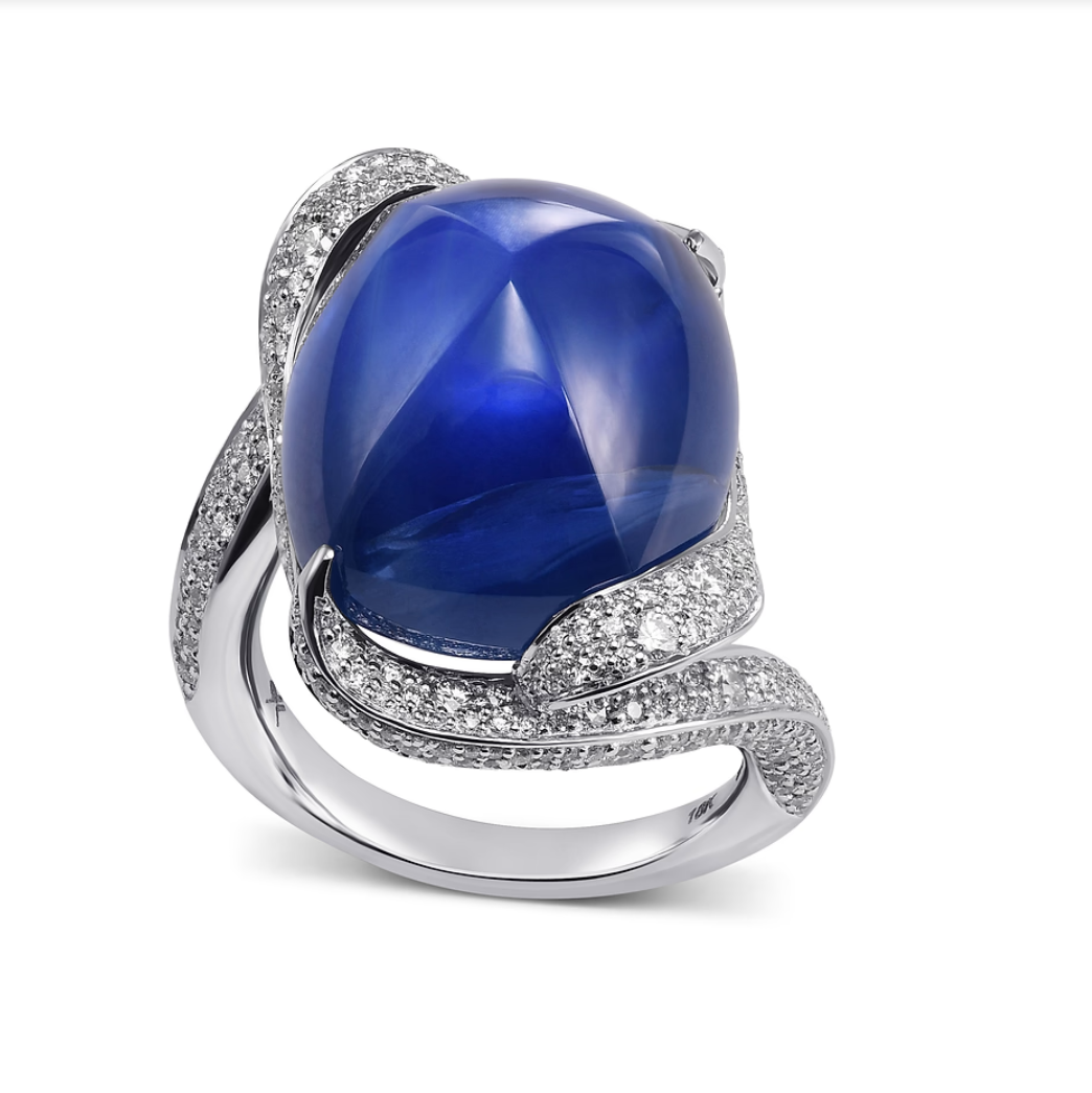 This exquisite ring by Leibish features a blue sapphire adorned with diamonds. They note, “Indulge in regal elegance with “Le Grand Bleu,” an exquisite royal blue sugarloaf cabochon sapphire and diamond ring. A rare, unheated antique Burma gemstone, weighing an impressive 29.26 carats and certified by GIA and SSEF, takes center stage. Encircled by a captivating undulating design of closed pave brilliants, this remarkable ring is mounted in an 18K white gold setting, creating a truly timeless and luxurious piece. For more information about this item please contact our customer service department.”
