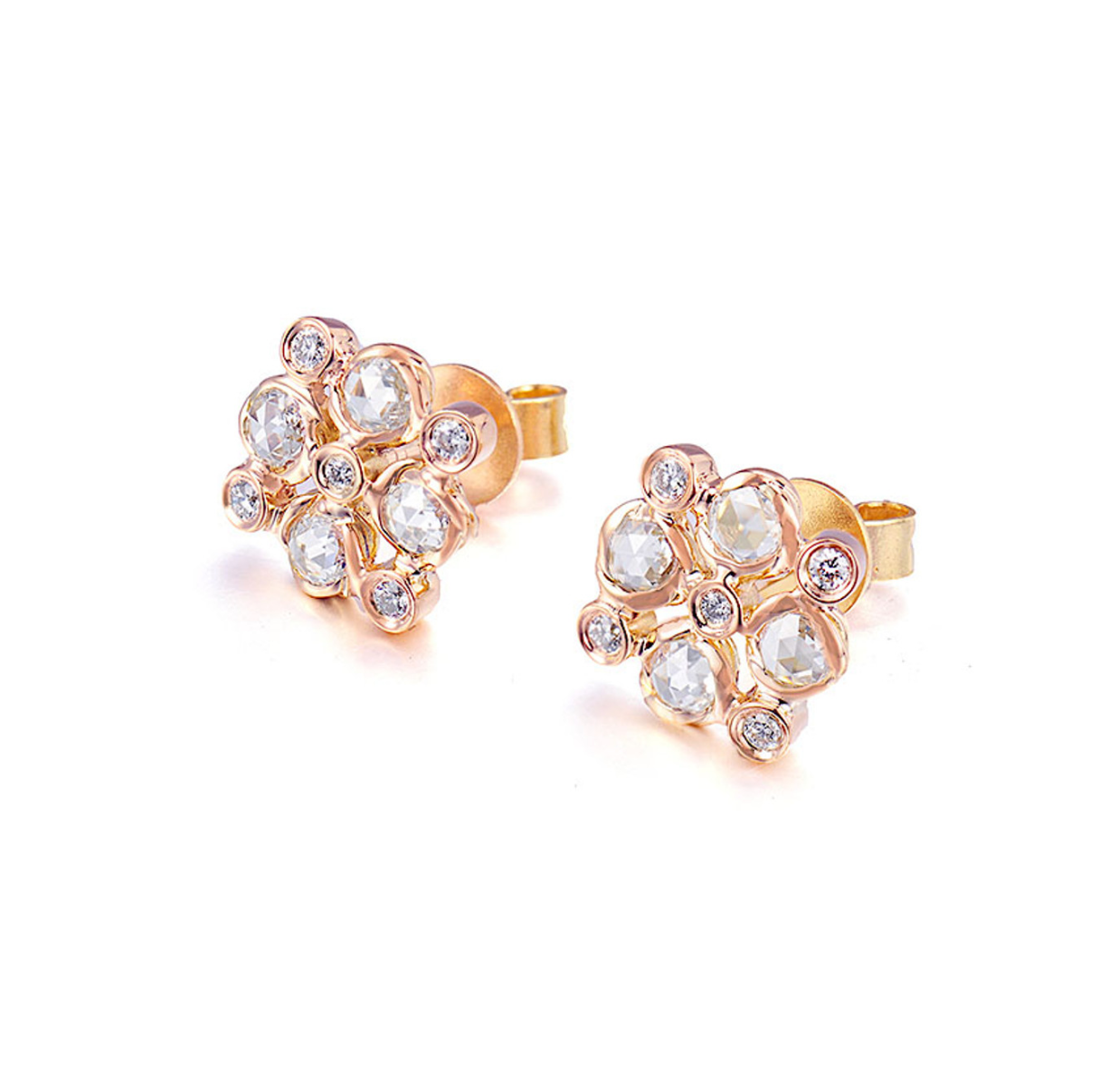 These studs from Huan Wang are made with 14k gold, set with 0.32cts of rose cut diamonds and 0.10cts of brilliant cut diamonds. You can select them in yellow, white or rose gold.