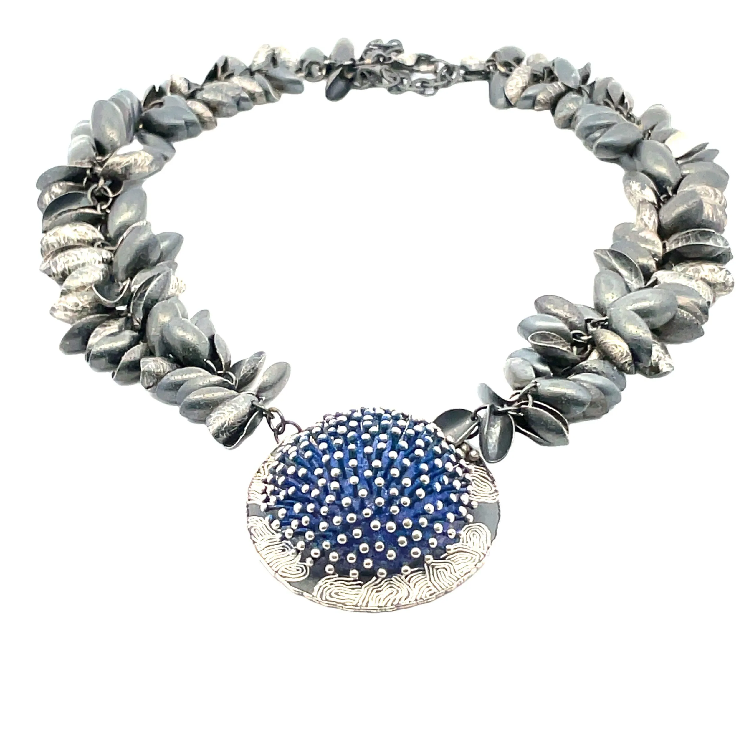 What a beautiful necklace by artisan So Young Park. It features his signature elements of sterling silver pods, oxidized, and gold leaf application. This piece also has blue powder coated enamel.