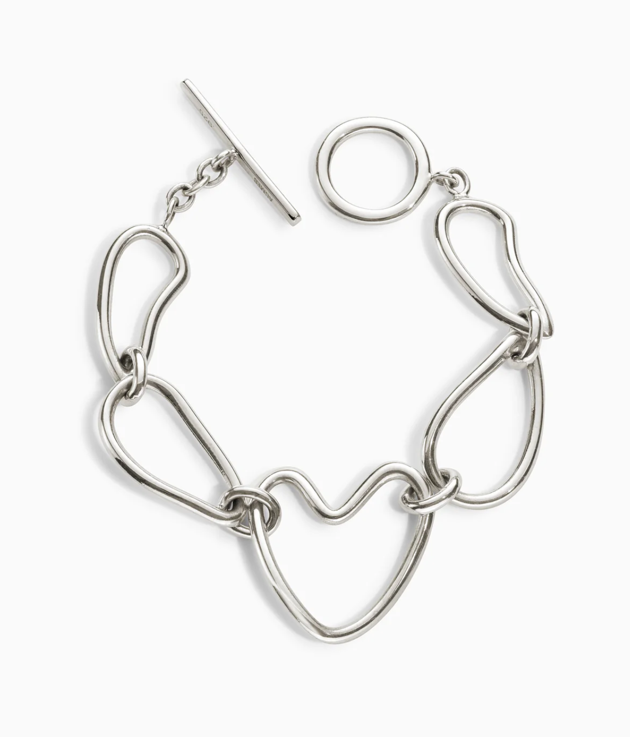 Made of sterling silver, it features elongated links and a stylized heart as the central motif.