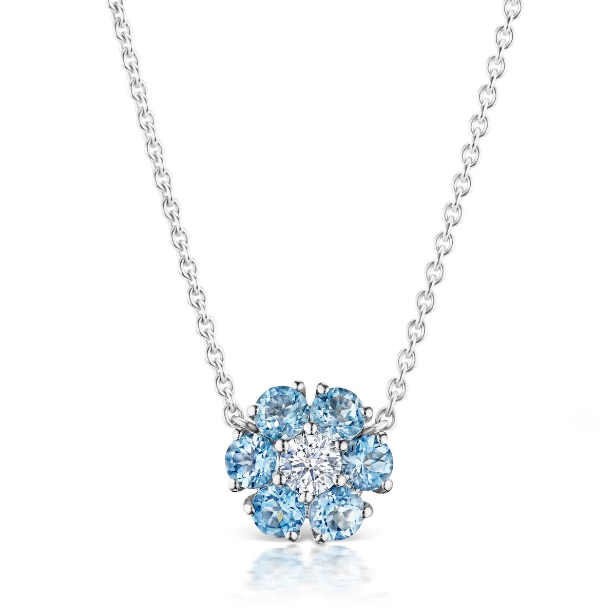 This design features a circle of aquamarines with a .08 diamond in the centre, on a fixed 18k white gold chain. Platinum is available upon request.