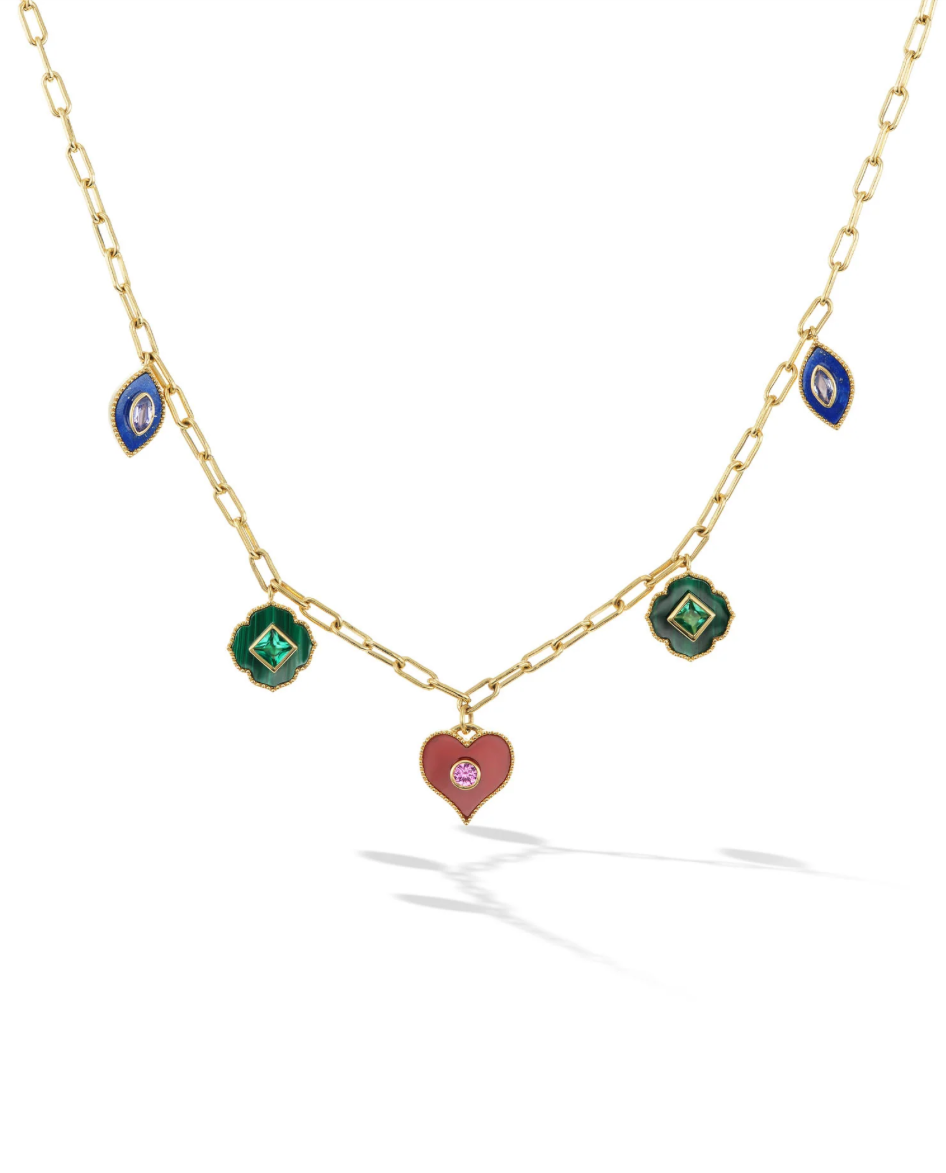 If you like talismans, you will love this necklace by Orly Marcel. Her site notes, “Featuring some of the most powerful spiritual symbols, celebrating love (heart), new beginnings (lotus) and (Marquise Eye) for protection.”