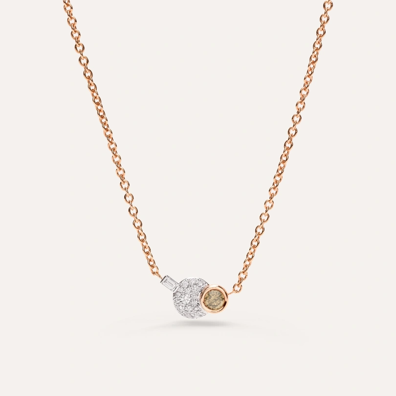 This elegant necklace by Pomellato features a mix of gold tones and stones. The chain is rose gold, the setting for the white diamonds is white gold, and it features small diamonds in various cuts.