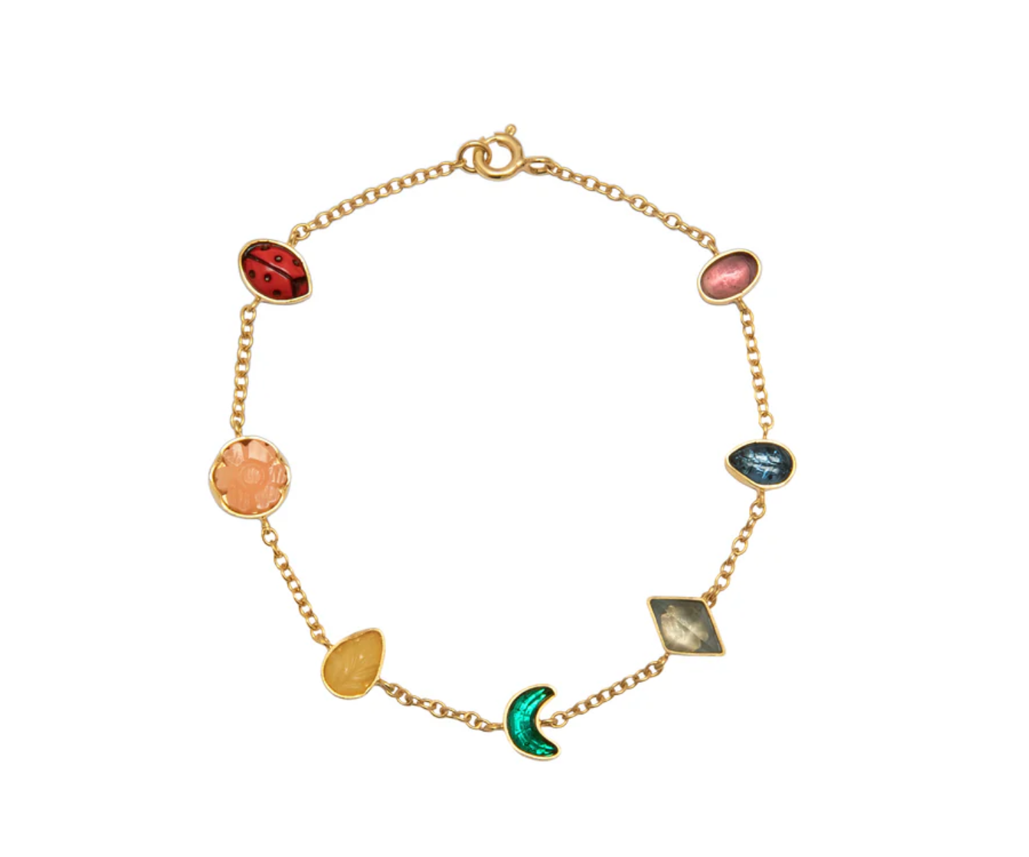 They note, “This piece is from our rainbow collection – all the colours in this delicate bracelet symbolising faith, hope and peace. Materials: Ethically sourced 18k gold-plated silver, amethyst, coral, vintage glass and yellowstone.”
