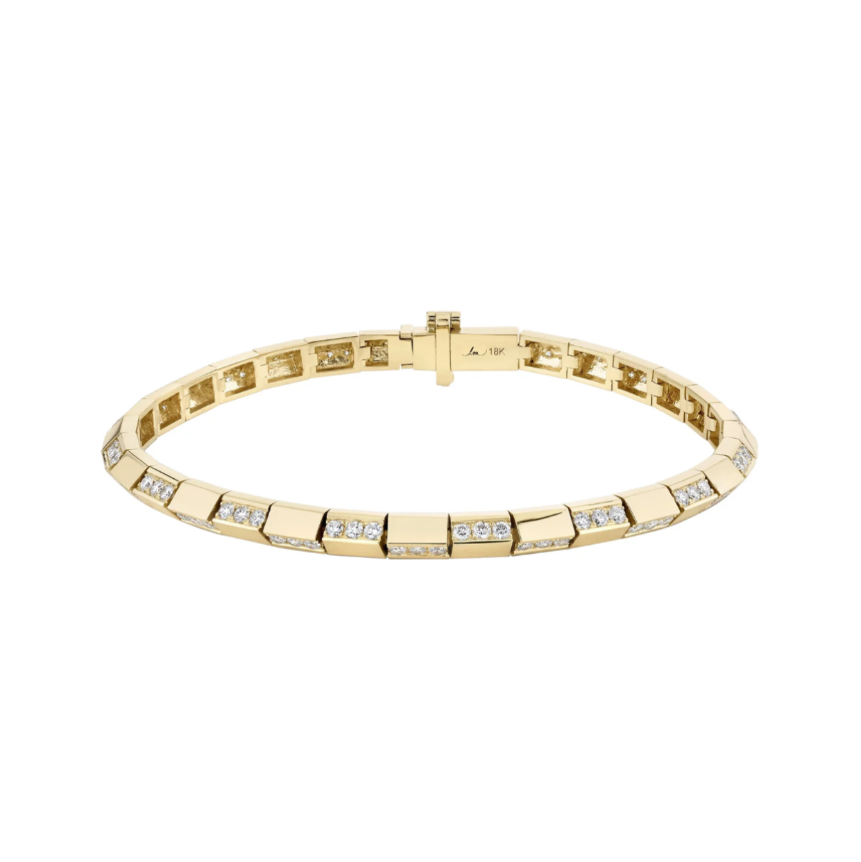 This piece by Lizzie Mandler is an interesting take on a tennis bracelet. It’s 18k yellow gold set with 1.78 carats of diamonds in an alternating pattern.