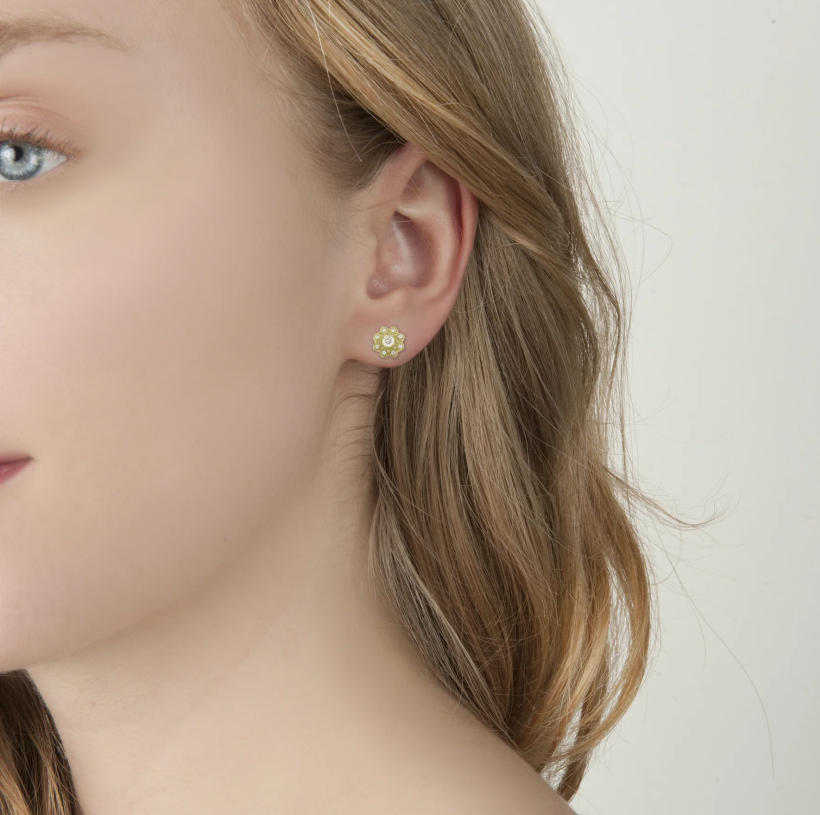 What I love about these petite earrings from Adel Chefridi is how wearable they are. He’s used 18k yellow gold set with .12 carats of white diamonds to add sparkle to a classic stud earring design.