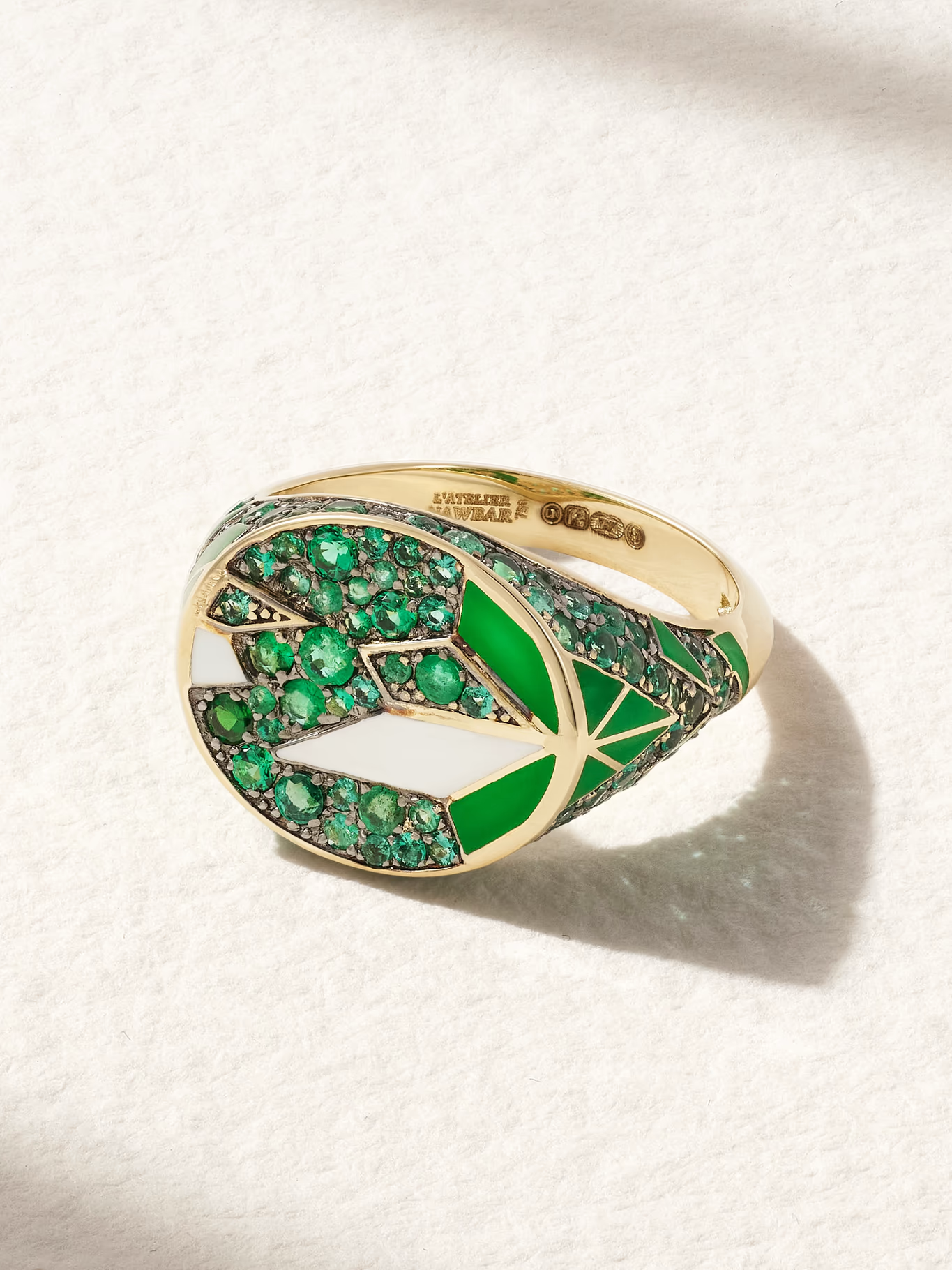 This ring by L’Atelier Nawbar is meant to be a visual representation of “each person’s multifaceted individuality. Impeccably crafted from 18-karat gold, this ring is set with scores of emeralds against a rhodium-plated base and shards of hand-painted green and white enamel in a mosaic-like pattern.“