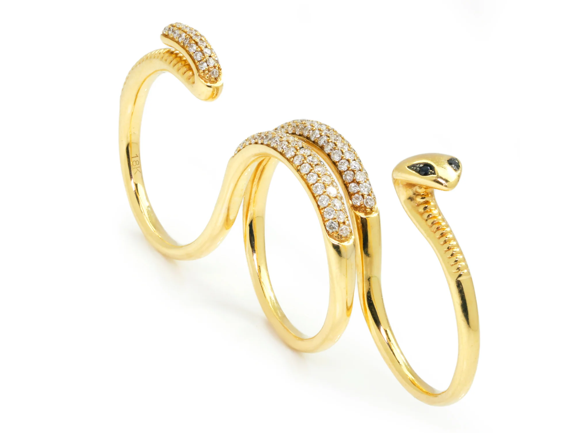 By Once Upon A Diamond it winds its way over three fingers. The site notes, “This exciting snake ring wraps around your three fingers and is currently a size 7. It is solid 18kt yellow gold, and it features round black diamonds for snake eyes and colorless diamonds encrusted on the middle body and tail. If you need this resized, consult us first to make sure our jeweler can perform this. It has over 3/4 carats of diamonds and weighs just over 12 grams. It is brand new.”