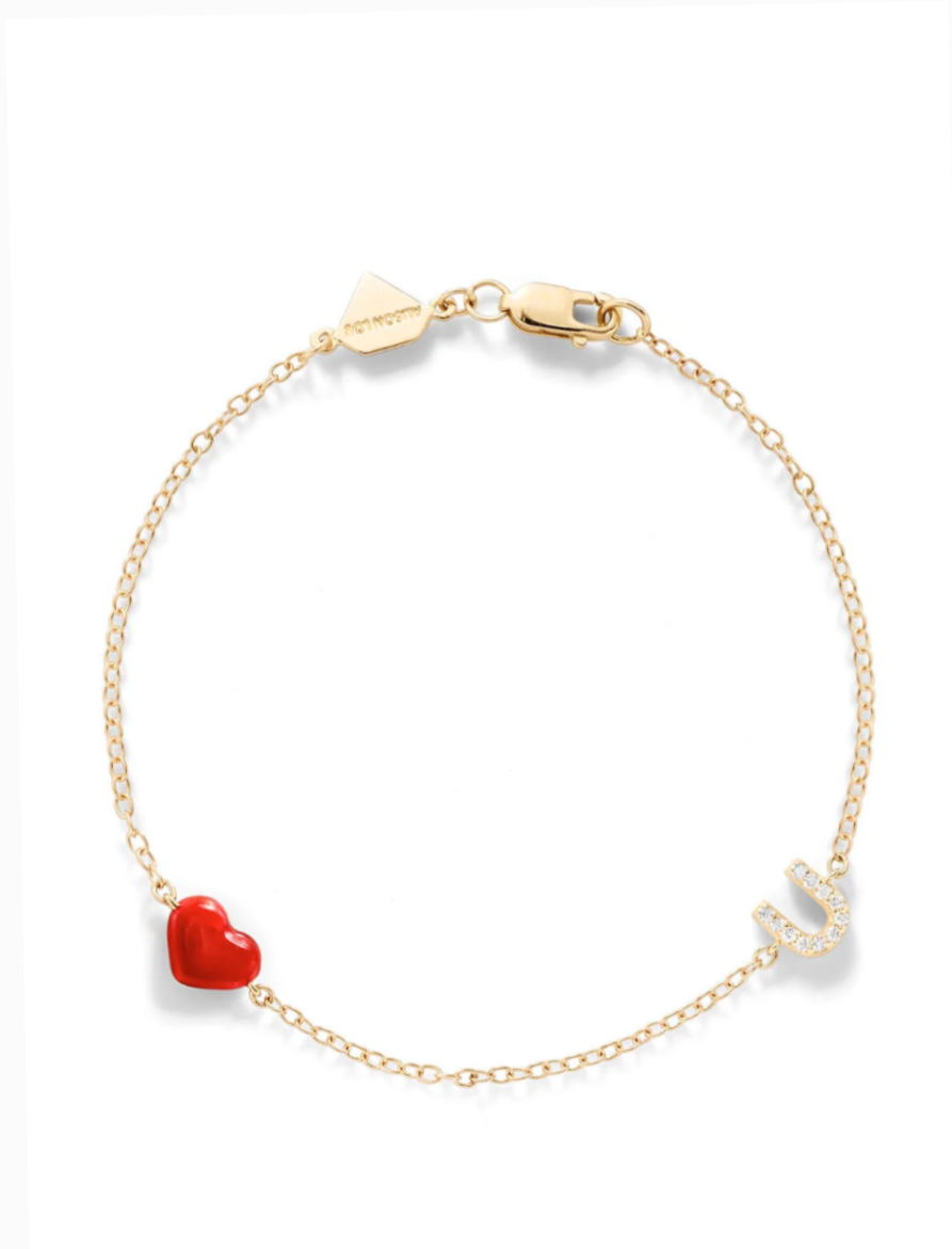 This adorable bracelet by Alison Lou truly is a perfect gift to let someone know you love them on that special day. It features an enamel heart (different colours are available) and a diamond pave U to form the sentiment ‘love you.’