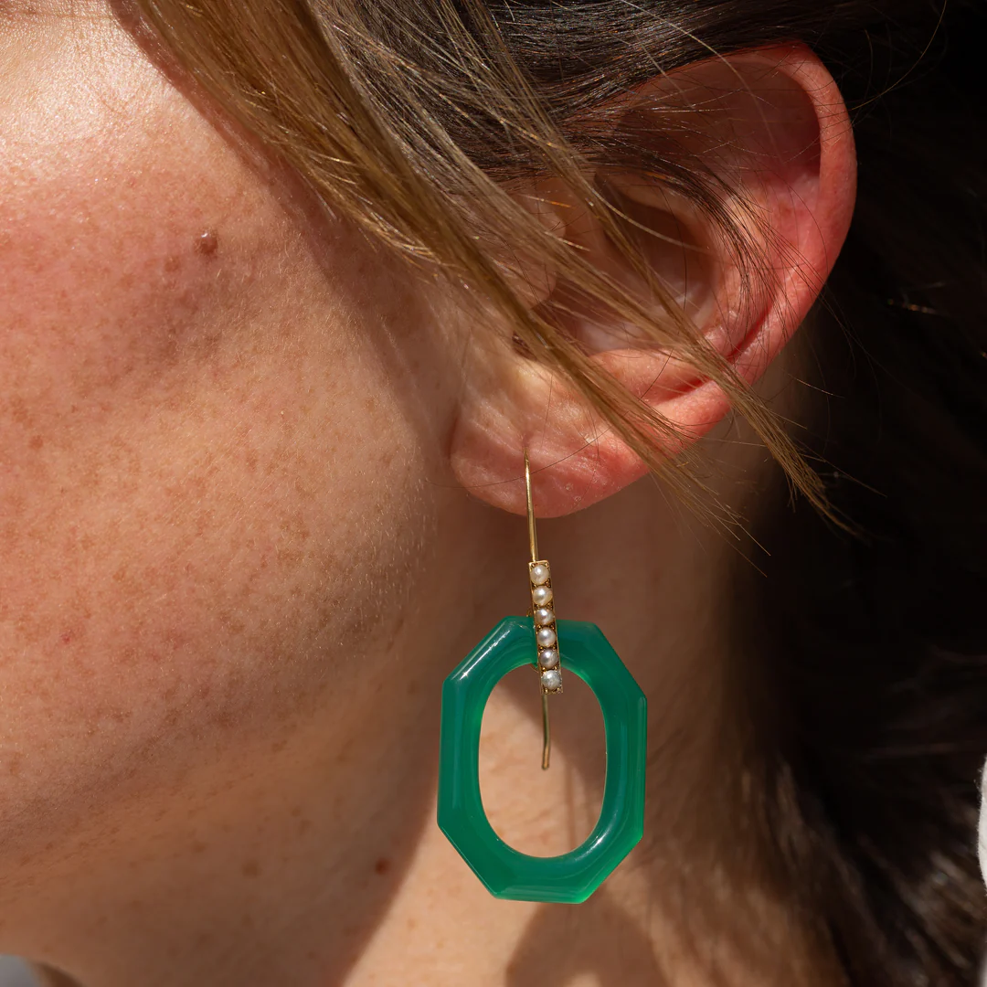 These deco looking earrings are made with green chalcedony, pearls and a 14k yellow gold setting.