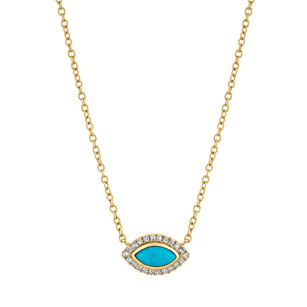 This is made with a marquise cut turquoise as the centerpiece, surrounded by .12 carats of diamonds in 18k yellow gold with an attached chain.