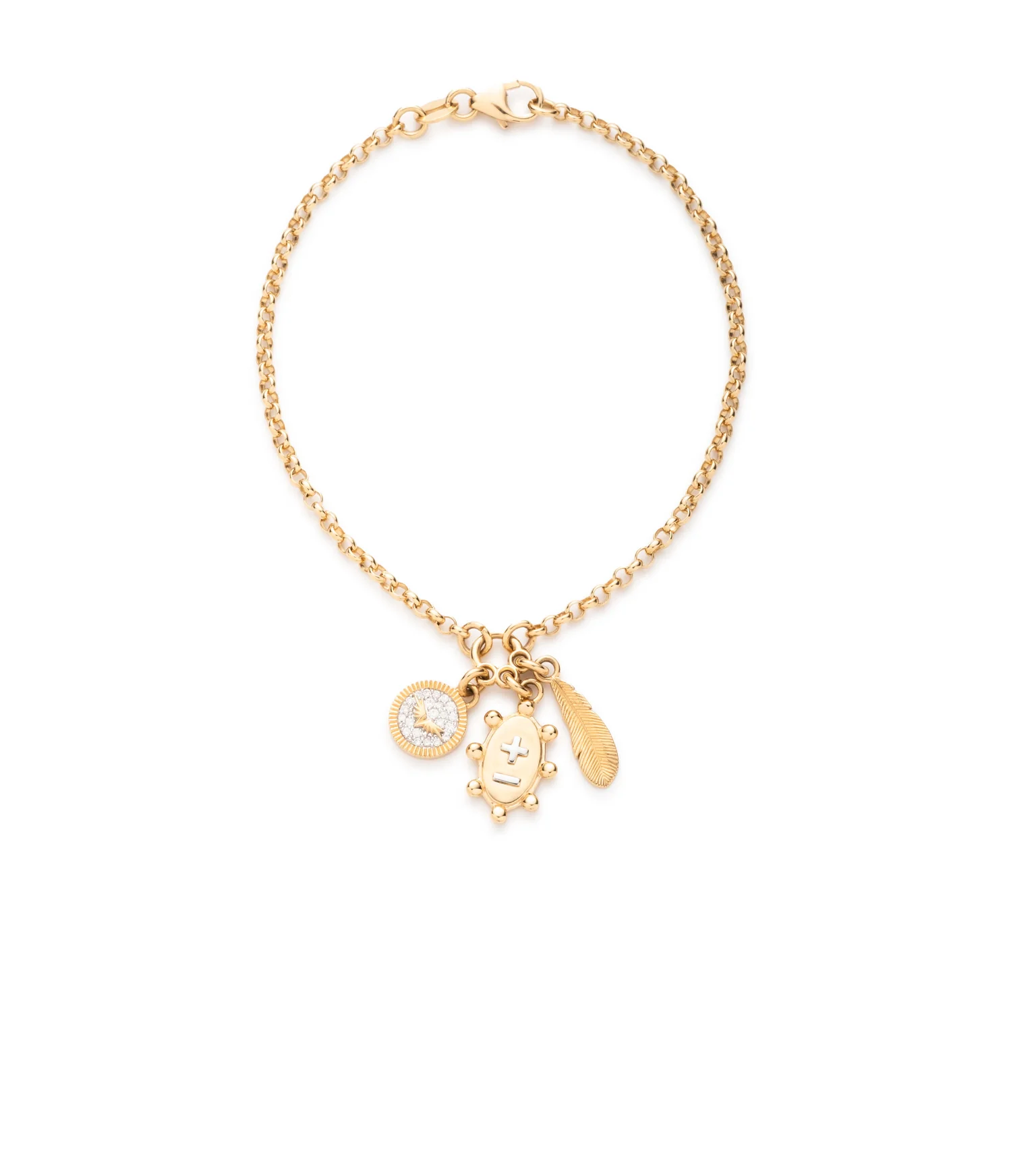They note, “Handcrafted in 18K yellow gold with pavé diamonds, our Vivacity Mini Cluster Small Belcher Chain Bracelet is available in 7″ & 8” lengths and features a cluster of mini medallions with symbols that represent the Latin word vivacitat, or life force. The vivacity tenet encourages us to live a life filled with exploration, discovery, and learning. The plus and minus signs denote a French expression: qu’hier, que demain, meaning ”more than yesterday and less than tomorrow,” a phrase that speaks to an ever-growing love and an ever-expanding life. The wings and feather pendant inspire us to take flight and soar in spite of our doubts and fears. If not now, when?”