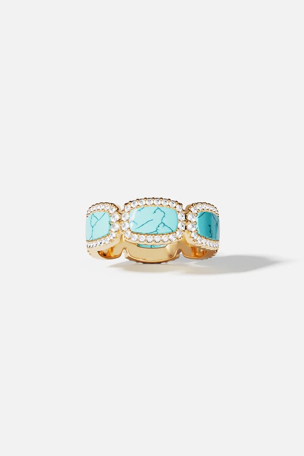 This ring from APM Monaco is described in such a way that you don’t really know what you are going to get: This ring is made with APM yellow alloy and 18k gold plated. It is microset with white cubic zirconia and adorned with turquoise colored stone.
