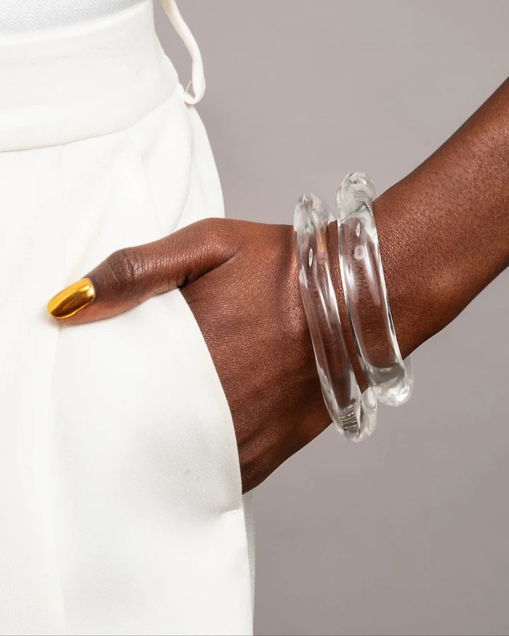 Alexis Bittar is well known for his use of lucite and acrylic in his costume jewelry line. Usually embellished with crystals, this bangle bracelet is a bit different in that it’s transparent and unadorned so it would go with anything you wear. As shown on the model, it also looks great worn in multiples.