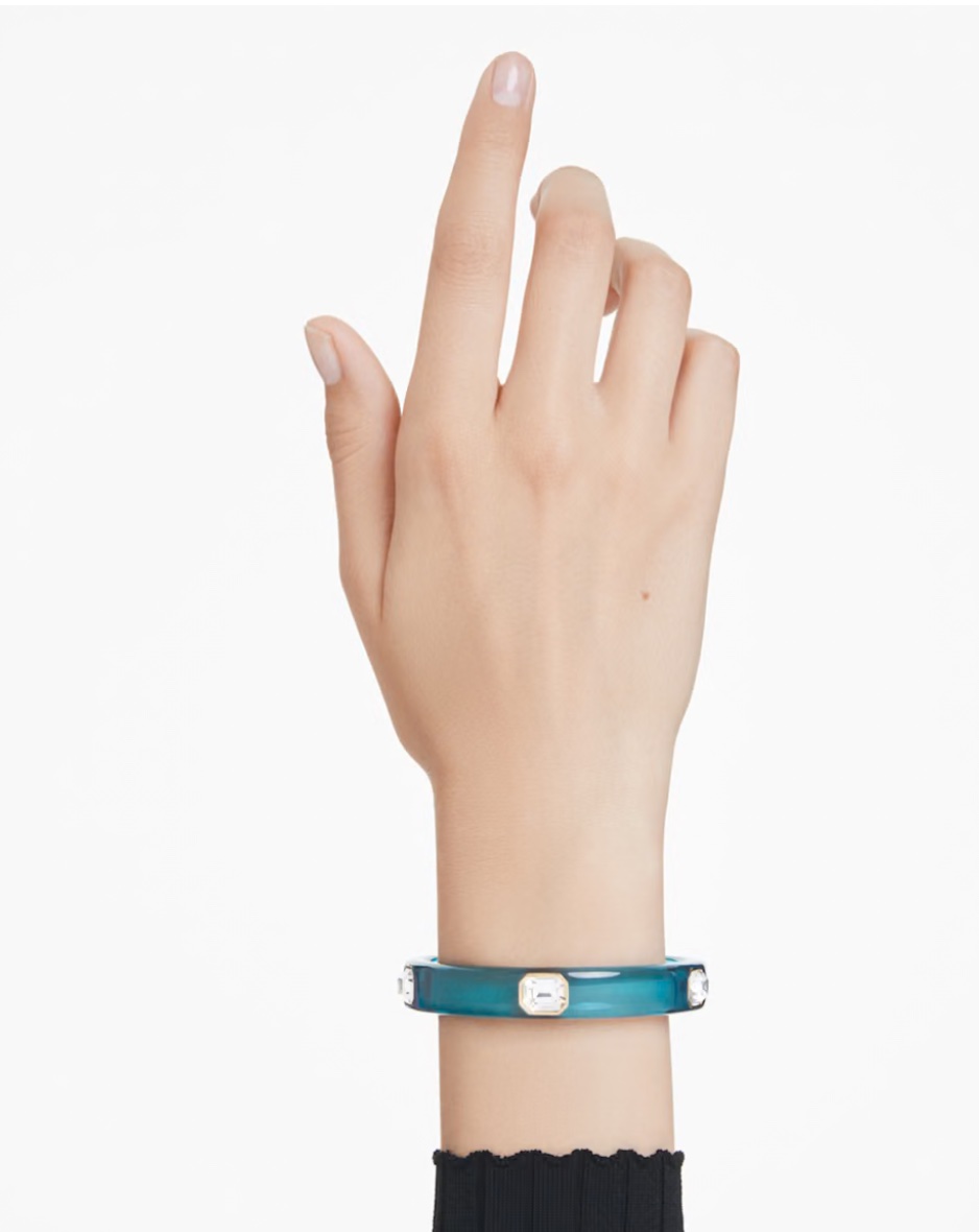 The company notes, “Be your vibrant best in this candy-coloured bangle from the Dulcis family. The delectable design features a vibrant blue band, embedded with five octagon-cut crystals in a gold-tone plated frame. A playful way to take your style from ordinary to astonishing.”