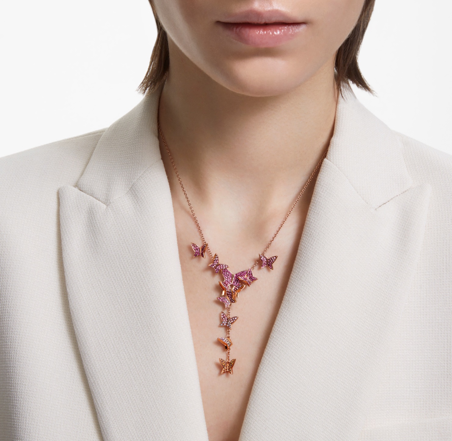 It’s summer sale time, a perfect opportunity to pick up something you may have had your eye on. This elegant butterfly motif Swarovski necklace is encrusted with pink stones, set in rose gold toned plated metal.