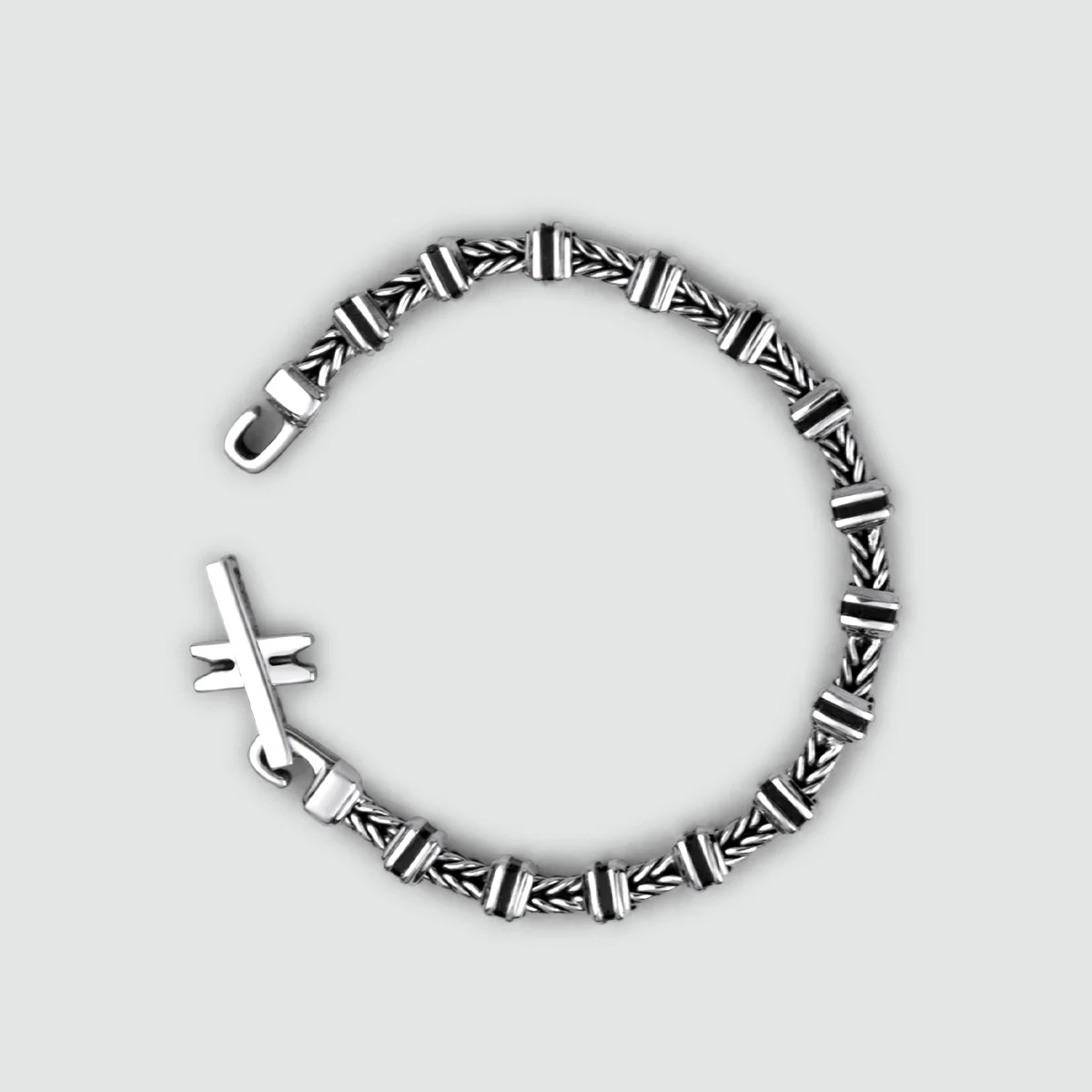 This is made of sterling silver with oxidized links and a rotating clasp for ease of closure.