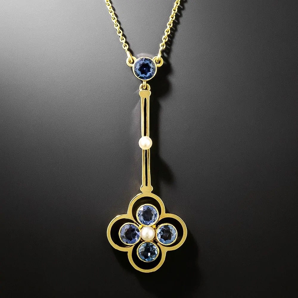 Seller Lang Antiques explains, “This necklace represents yet another facet of Victorian jewelry: understated elegance. Dainty and beautifully restrained in design, it features a clover-like element set with light violet-blue sapphires and a single natural pearl, crowned by a pearl-accented open bar element. The light and airy assemblage swings beneath a bezel-set sapphire that connects to a 16-inch cable chain. Low-key decor to grace your neckline.”