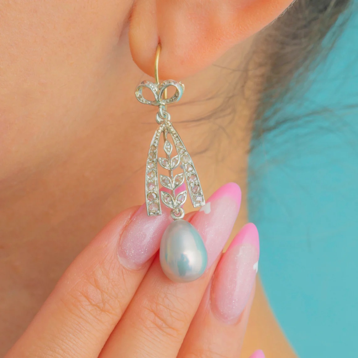 These earrings feature a diamond set drop accented with a pear shaped pearl and topped with a tiny diamond accented bow. Though platinum was more favored in the Edwardian years, 18k white gold was also used.