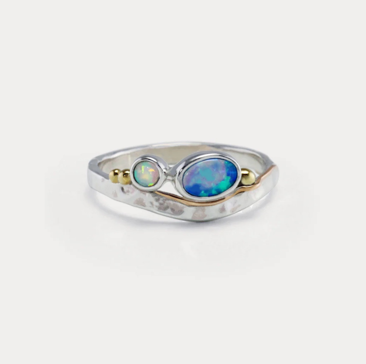 This ring from British brand Isla Silver features a white and a blue opal set in sinuous bands of sterling silver.