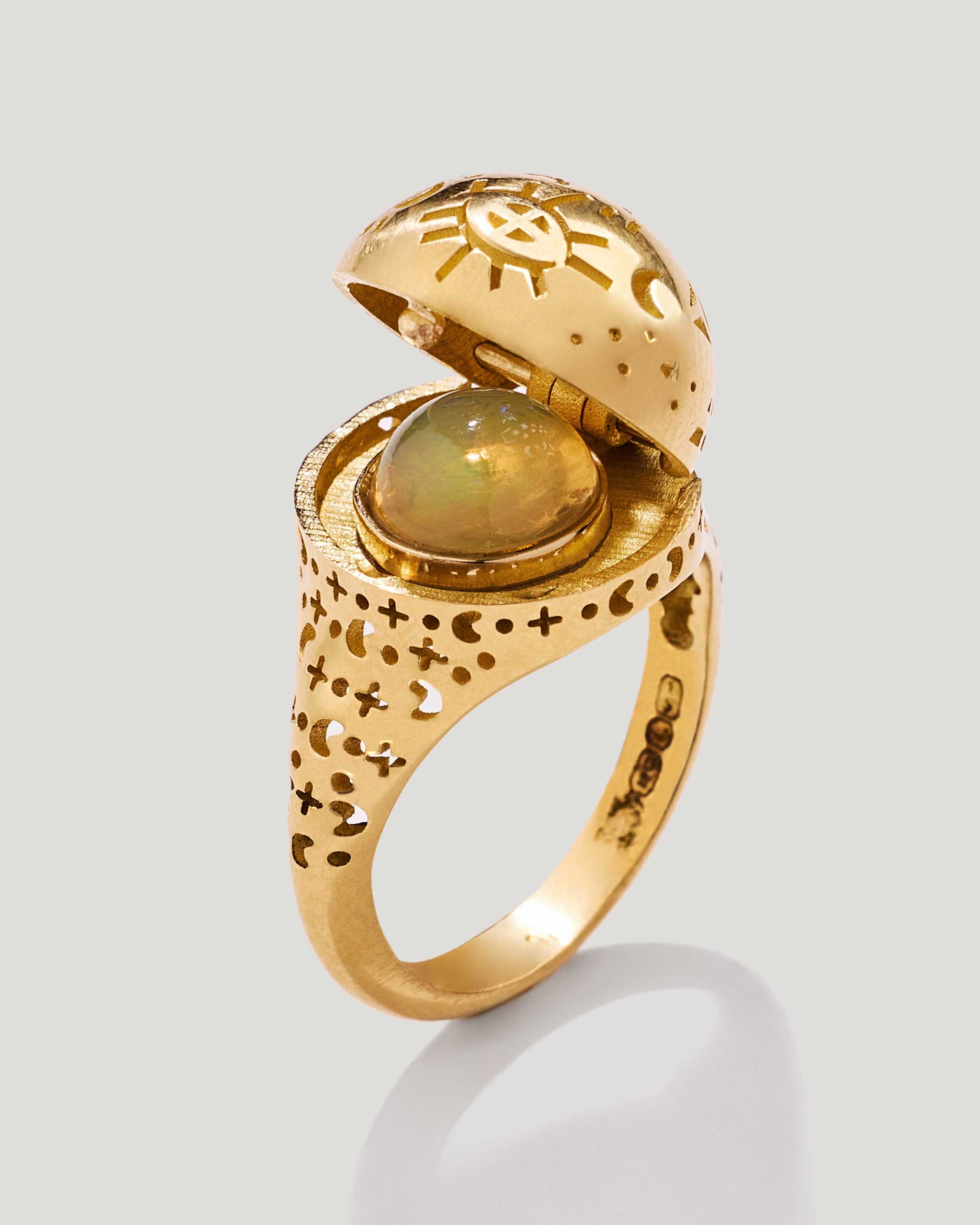 This 18k yellow gold ring from Pari Jewel is reminiscent of medieval poison rings, only under the golden dome is a cabochon opal. It can be glimpsed when the compartment is closed due to the openwork design.